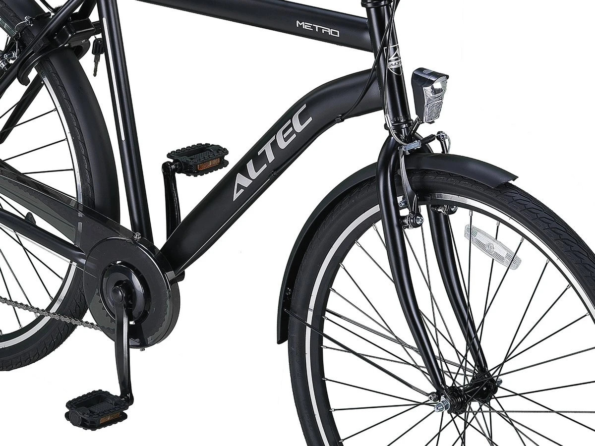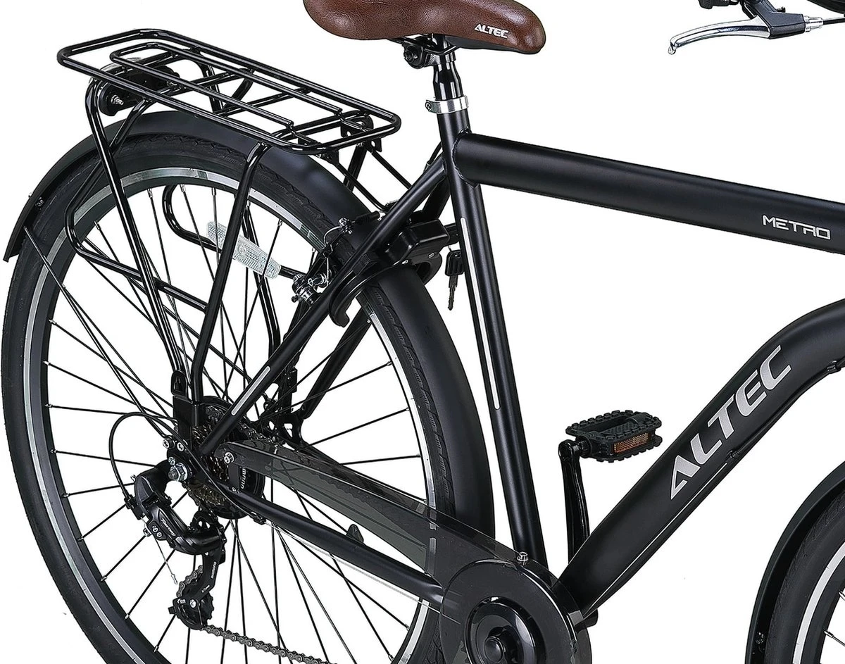 Altec Metro Herenfiets 28 inch 56cm 7vOnze Altec fietsen zijn nog niet afgemonteerd en worden in een doos verstuurd. Zie de handleiding onderaan voor instructies. Altec Metro Herenfiets 28 inch 56cm 7v De Altec Metro is een betaalbare stadsfiets met maar liefst 7 Shimano versnellingen. Een stadsfiets met dit aantal versnellingen tegen deze prijs vind je niet snel! Altec Metro Herenfiets 28 inch 56cm 7v stadsfiets beschikt over een aantal fijne eigenschappen. De prijs is wellicht het eerste wat je opvalt en dat is zeker een goed aspect van deze fiets. Het design van deze fiets is bovendien erg modern en komt dan ook goed tot zijn recht in een stedelijke omgeving. Zwart is sowieso een kleur die erg mooi staat. Het materiaal van het frame is staal. Hierdoor is de fiets wel wat zwaarder, maar aan de andere kant ook erg stevig. Let wel op, oxidatie is bij staal niet uit te sluiten. Daarom kunnen we je als tip meegeven deze in te spuiten met blanke lak.Je kunt de fiets onder controle houden door middel van de veilige V-brake handremmen. Het beste aan deze elegante stadsfiets zijn toch wel de 7 versnellingen. Hiermee zijn de snelheid en trapzwaarte van jouw fiets altijd op het niveau dat perfect is voor jou. De velgen bestaan, in tegenstelling tot het frame uit aluminium. Lichtgewicht en roestvrij dus! Voor de fanatieke fietser die ook s’ nachts gebruikt wilt maken van de Altec Metro, zit er op zowel de voor als achterkant LED verlichting. De Altec Metro is een leuke fiets voor een scherpe prijs. De v-brake en derailleur moeten nauwkeurig en met enige regelmaat afgesteld worden voor een optimale prestatie. Dit is een leuke fiets voor af en toe waar je niet een hele grote verwachting bij moet hebben. Voor dagelijks en intensief gebruik kunnen we andere alternatieven aanbieden. Zoals hierboven weergegeven. De Altec Metro kan je in doos of rijklaar aanschaffen. Ons advies is om een fiets altijd rijklaar aan te schaffen. Dit komt omdat het afstellen van de derailleur versnellingen lastig kan zijn. Zo weet je zeker weet dat een fiets door een vakkundige monteur is afgemonteerd. Een veilige en goede montage is niet alleen belangrijk voor goede prestaties van de fiets, maar ook voor de slijtagegevoeligheid van bepaalde onderdelen. Meer informatie over de Altec metro (https://www.superfietsen.nl/service/informatie-over-de-altec-metro/) Shimano derailleur 7: Shimano derailleur 7 biedt een zeer ruime keuze in versnellingen